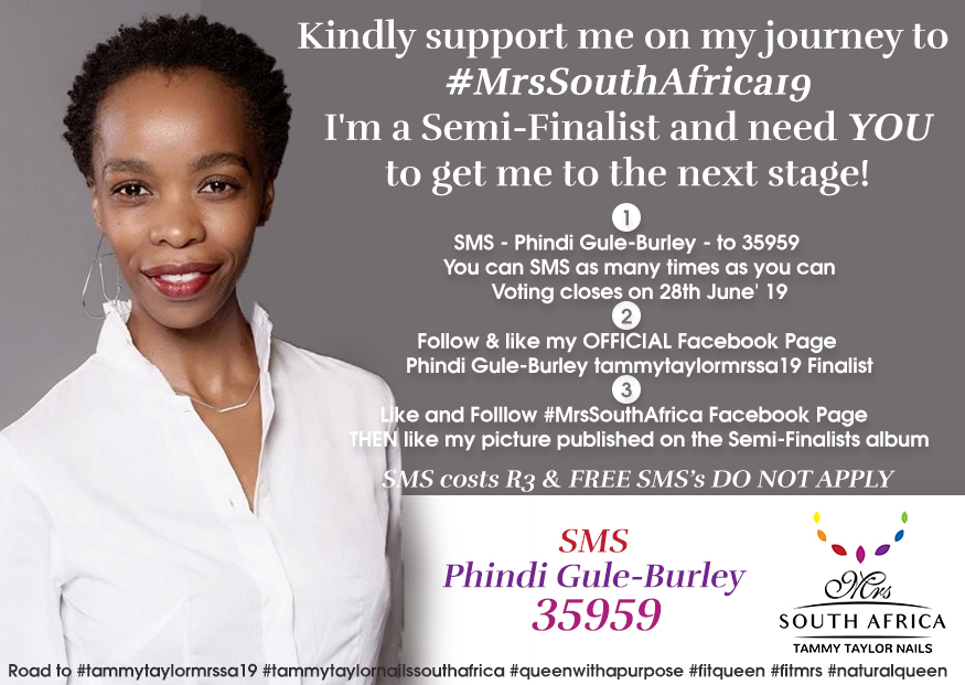 PhindiGule-Burley-MrsSouthAfrica2019 Published March 13, 2019 | By admin Full size is 875 × 621 pixels Official Phindi Gule-Burley (Mrs South Africa Vote Card) » « follow_fb